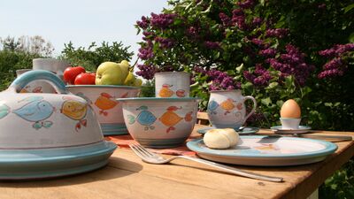 Schöne Keramik für den täglichen Gebrauch! Handgefertigt in Fayencentechnik. Dekor: Fische und Tulpen. Spülmaschinengeeignet.