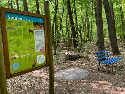 Infotafel: verschiedene Waldtiere werden vorgestellt (Wolf, Rotfuchs, Wildschwein, Rothirsch, Reh und Eichelhäher)