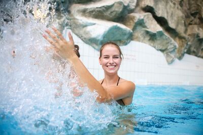 Auf 600 m² Wasserfläche mit Sport-, Kinder- und Wellenbecken sowie Sprung- und Rutschanlage bieten sich hervorragende Möglichkeiten für Sport und Spaß mit der Familie oder den Schul- und Vereinssport. Der Saunabereich ist im mediterranen Stil gehalten. Kurs- und Massageangebote runden das Angebot ab.