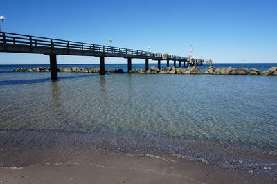 Die Seebrücke im Ostseebad Wustrow glänzt mit 240 Metern. Sie wurde 1992/93 erbaut und auf Stahlpfeiler gesetzt.